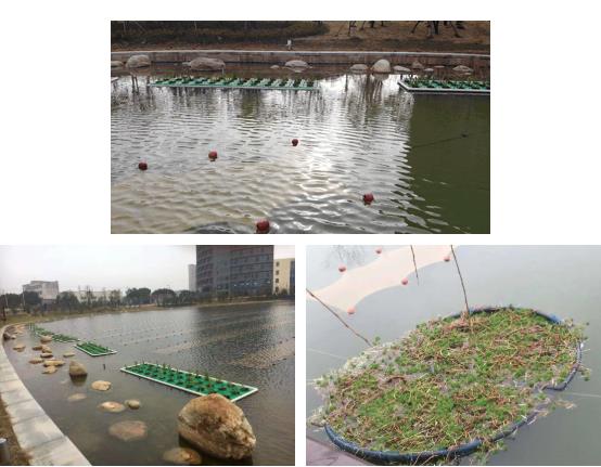 由于湖中生物缺失,種植了總面積為500平方米的植物,選擇了冬季耐寒的水生植物——菖蒲(長方形,共456平方米)、金魚藻(圓形浮島,共44平方米),來加強氨氮和總磷的降解,從而恢復(fù)整個湖體的生態(tài)系統(tǒng)。LGe新型光催化網(wǎng)_水庫治理_河道治理_水生態(tài)修復(fù)_水環(huán)境治理與修復(fù)_江蘇雙良環(huán)境科技有限公司