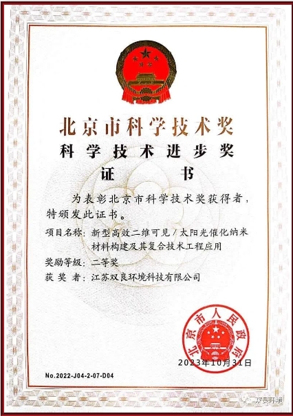 近日,江蘇雙良環(huán)境科技有限公司參與的項(xiàng)目《新型高效二維可見/光催化納米材料構(gòu)建及其復(fù)合技術(shù)工程應(yīng)用》榮獲北京市科學(xué)技術(shù)進(jìn)步獎(jiǎng)二等獎(jiǎng)。