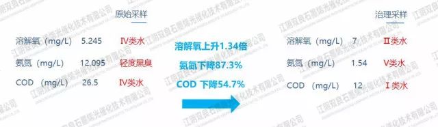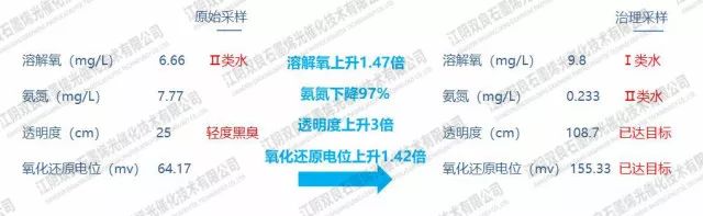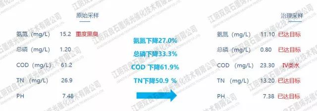 治理后已消除黑臭,并且水質指標已接近Ⅳ類水。gaP新型光催化網_水庫治理_河道治理_水生態(tài)修復_水環(huán)境治理與修復_江蘇雙良環(huán)境科技有限公司