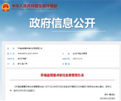 為了加強對環(huán)境監(jiān)管重點單位的監(jiān)督管理,強化精準(zhǔn)治污,根據(jù)《中華人民共和國環(huán)境保護法》和水、大氣、噪聲、土壤等污染防治法律,以及地下水管理、排污許可管理等行政法規(guī),制定本辦法。《環(huán)境監(jiān)管重點單位名錄管理辦法》已于2022年8月15日由生態(tài)環(huán)境部2022年第四次部務(wù)會議審議通過,現(xiàn)予公布,自2023年1月1日起施行。