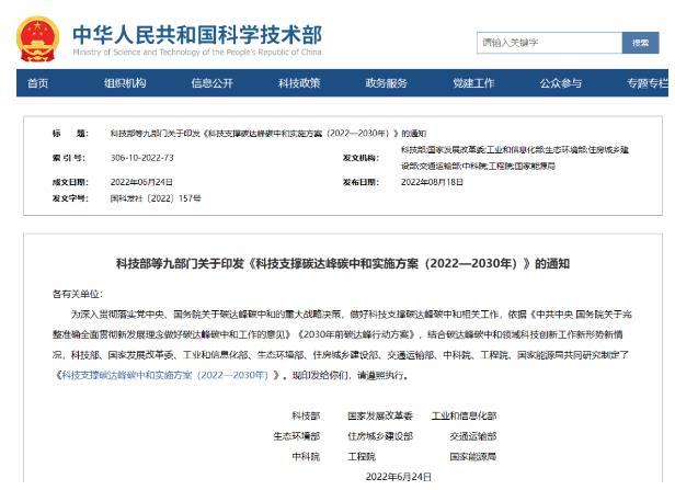 為深入貫徹落實(shí)黨中央國(guó)務(wù)院關(guān)于碳達(dá)峰碳中和的重大決策部署,按照碳達(dá)峰碳中和“1+N”政策體系的總體安排,科技部會(huì)同發(fā)展改革委、工業(yè)和信息化部、生態(tài)環(huán)境部、住房和城鄉(xiāng)建設(shè)部、交通運(yùn)輸部等九部門(mén)組織編制了《科技支撐碳達(dá)峰碳中和實(shí)施方案(2022—2030年)》,《實(shí)施方案》統(tǒng)籌提出支撐2030年前實(shí)現(xiàn)碳達(dá)峰目標(biāo)的科技創(chuàng)新行動(dòng)和保障舉措,并為2060年前實(shí)現(xiàn)碳中和目標(biāo)做好技術(shù)研發(fā)儲(chǔ)備,為全國(guó)科技界以及相關(guān)行業(yè)、領(lǐng)域、地方和企業(yè)開(kāi)展碳達(dá)峰碳中和科技創(chuàng)新工作的開(kāi)展起到指導(dǎo)作用。