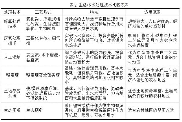 農(nóng)村生活污水末端治理工藝可分為生物處理技術(shù)和生態(tài)處理技術(shù)兩大類。生物處理技術(shù)主要包括好氧生物處理和厭氧生物處理兩大類;生態(tài)處理技術(shù)主要包括人工濕地、穩(wěn)定塘、土地滲濾系統(tǒng)。生態(tài)廁所是基于過(guò)程控制應(yīng)用的技術(shù),其對(duì)黑水的后續(xù)處理起關(guān)鍵作用。生活污水處理技術(shù)具體的特點(diǎn)和適用范圍見(jiàn)表2。