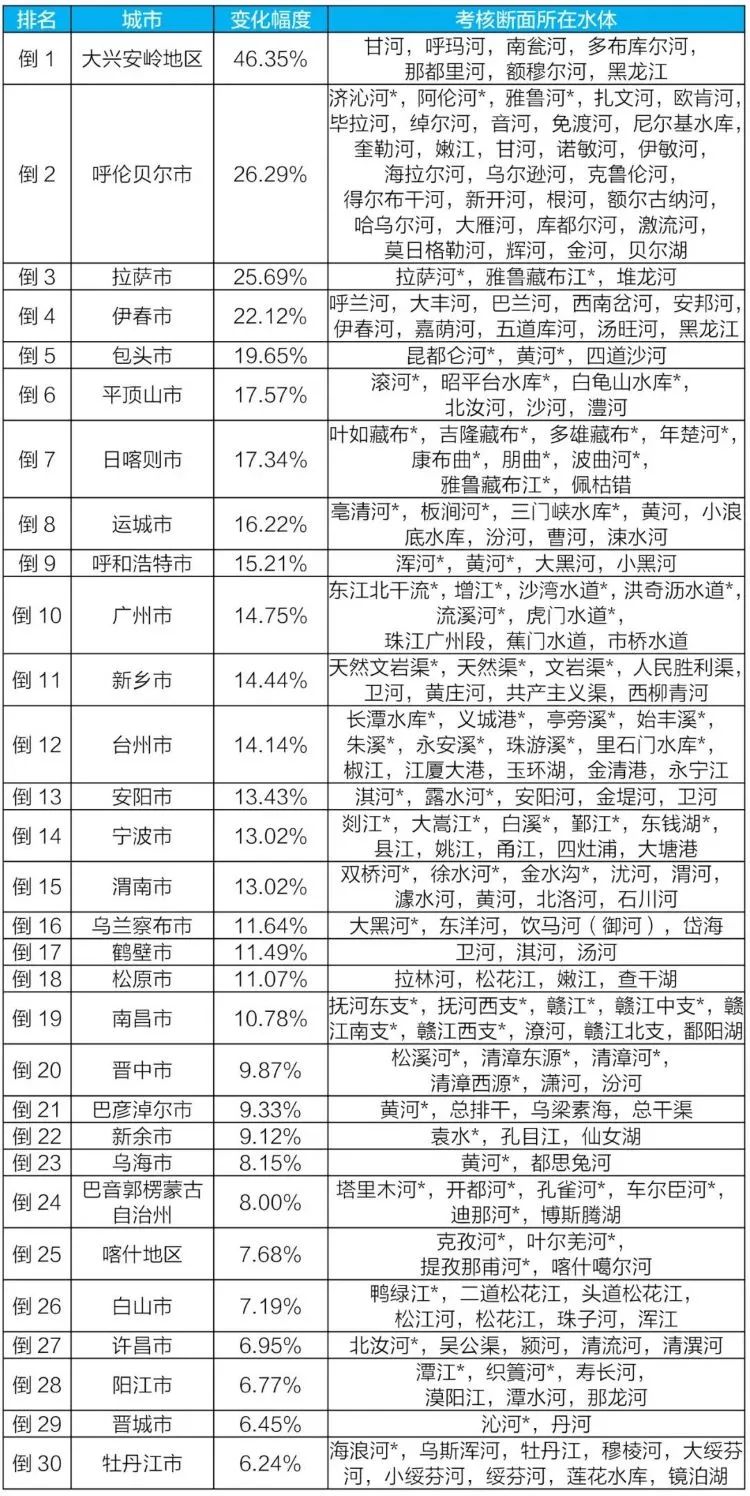 注:城市地表水環(huán)境質(zhì)量變化程度排名基于城市水質(zhì)指數(shù)變化率,按變化率從小到大的順序進行排名,變化率為負(fù)值表示水質(zhì)改善,正值表示水質(zhì)變差。絕對值越大,表示變化程度越大。bGJ新型光催化網(wǎng)_水庫治理_河道治理_水生態(tài)修復(fù)_水環(huán)境治理與修復(fù)_江蘇雙良環(huán)境科技有限公司