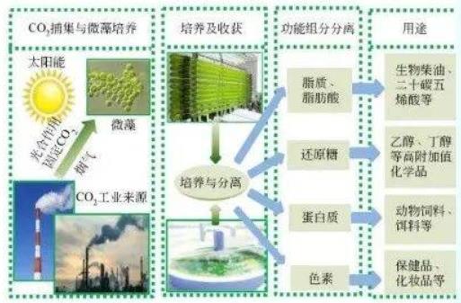 利用微藻生物固碳,固定的二氧化碳不僅可以進入碳匯市場進行交易,同時固碳后產(chǎn)生的微藻生物質(zhì)可以開發(fā)成各種微藻源產(chǎn)品,具有較高的經(jīng)濟價值,可以實現(xiàn)顯著的經(jīng)濟效益和生態(tài)效益。
