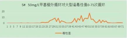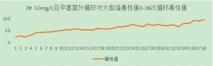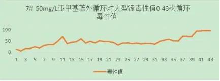 50mg/L亞甲基藍(lán)溶液外循環(huán),水槽中是否加入光催化網(wǎng)進(jìn)行對(duì)照試驗(yàn),60min/循環(huán),收集排水再循環(huán),4L。實(shí)驗(yàn)運(yùn)行43次循環(huán)。從大型溞毒性值與循環(huán)數(shù)的關(guān)系上,可以看出50mg/L亞甲基藍(lán)溶液對(duì)大型溞有較小影響。FNZ新型光催化網(wǎng)_水庫(kù)治理_河道治理_水生態(tài)修復(fù)_水環(huán)境治理與修復(fù)_江蘇雙良環(huán)境科技有限公司