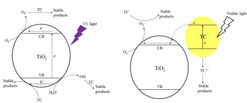 2分別在紫外及可見光照射下降解TC的機(jī)理示意圖