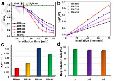 LvF新型光催化網(wǎng)_水庫治理_河道治理_水生態(tài)修復(fù)_水環(huán)境治理與修復(fù)_江蘇雙良環(huán)境科技有限公司圖2(a)可見光光催化降解100mlTC(10 mg/L),光催化劑用量:50mg,λ >420nm;(b)一級(jí)反應(yīng)動(dòng)力學(xué)方程;(c)反應(yīng)速率常數(shù)k;(d)赤泥-350℃降解TC的光催化穩(wěn)定性試驗(yàn)。