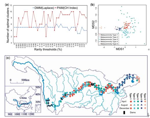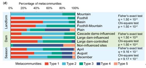 圖6 沿江優(yōu)勢群落組成。(a)對不同閾值采用兩種常用的分割方法的穩(wěn)定性。最佳族群的數(shù)目由Calinski-Harabasz指數(shù)和拉普拉斯近似法表明。(b)非計(jì)量多維標(biāo)度(NMDS)圖顯示了用DMM方法劃分的5種不同亞群落類型之間的區(qū)別。(c)長江沿岸3個(gè)季節(jié)所有沉積物樣品的亞群落類型分布。(d)蒙特卡羅模擬的Fisher精確檢驗(yàn)和Chisquare檢驗(yàn)對群落類型與地貌類型、壩況類型和季節(jié)類型劃分之間的關(guān)聯(lián)性。Ka2新型光催化網(wǎng)_水庫治理_河道治理_水生態(tài)修復(fù)_水環(huán)境治理與修復(fù)_江蘇雙良環(huán)境科技有限公司