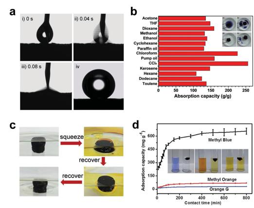 Ka2新型光催化網(wǎng)_水庫治理_河道治理_水生態(tài)修復(fù)_水環(huán)境治理與修復(fù)_江蘇雙良環(huán)境科技有限公司圖1 a)3D石墨烯氣凝膠作為吸附劑,用于從水中去除有機(jī)污染物。 a-i-aiii)一滴十六烷的吸收過程的視頻快照,以及a-iv)石墨烯氣凝膠表面上的水滴的光學(xué)照片。b)石墨烯氣凝膠對不同有機(jī)溶劑的吸收能力。 c)吸附/解吸循環(huán)顯示石墨烯氣凝膠對正己烷具有極好的可回收性。 d)不同染料的石墨烯氣凝膠的吸收能力。