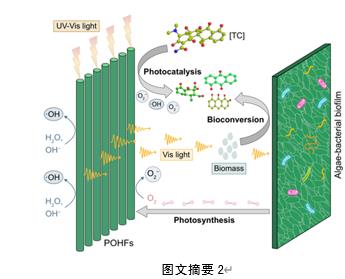 2涂層的POHFs能夠提供高光強(qiáng)來促進(jìn)生物膜的生長。由此產(chǎn)生的高光催化活性可快速穩(wěn)定地降低含四環(huán)素廢水的毒性,并提高其可生化性。富含Salinarimonas,Coelastrella sp.和Rhizobium的生物膜保持其快速光催化降解和中間產(chǎn)物生物轉(zhuǎn)化的活性,以產(chǎn)生光催化所需的O