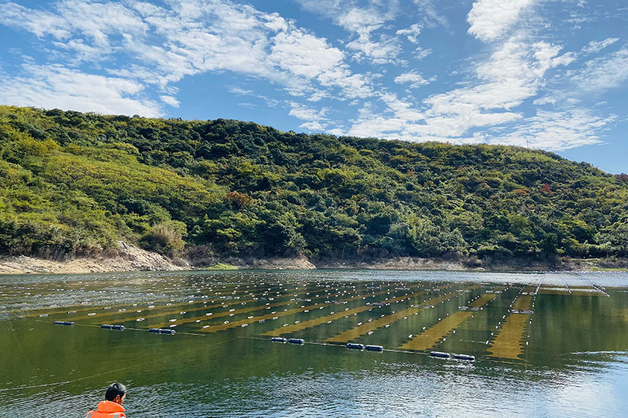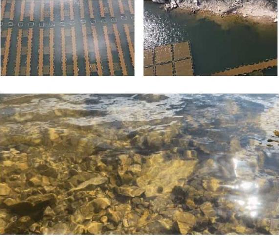 該項(xiàng)目于今年4月底開(kāi)始施工,5月底光催化 網(wǎng)敷設(shè)完整,7月底沉水植物施工結(jié)束。(共 計(jì)敷設(shè)光催化網(wǎng)1200張;放置半沉水植物浮 框180個(gè)。)